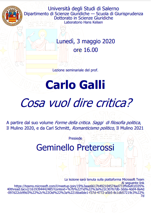 Lezione seminariale del Prof. Carlo Galli, a partire dal suo volume Forme della critica. Saggi di filosofia politica, Il Mulino 2020, e da Carl Schmitt, Romanticismo politico, Il Mulino 2021