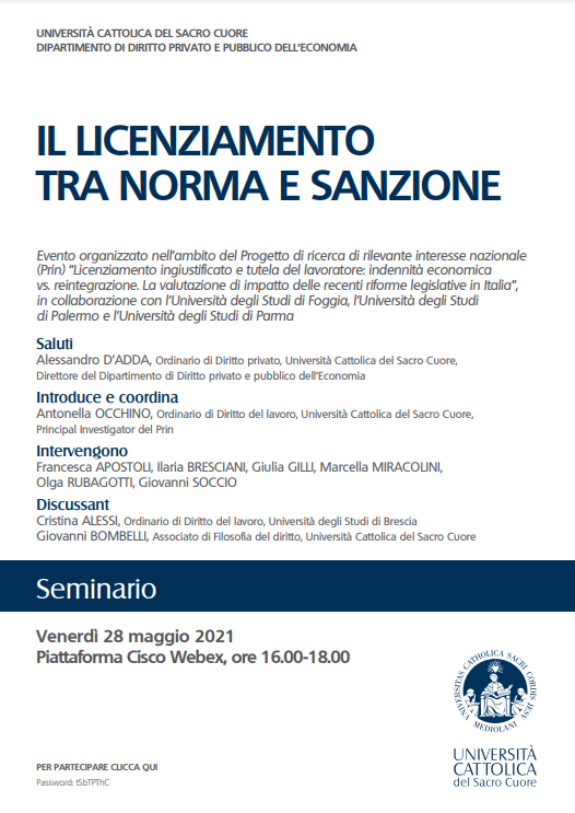 Evento organizzato nell’ambito del P.R.I.N. “Licenziamento ingiustificato e tutela del lavoratore: indennità economica vs. reintegrazione. La valutazione di impatto delle recenti riforme legislative in Italia”. Saluti Alessandro D’Adda (Università Cattolica del Sacro Cuore)