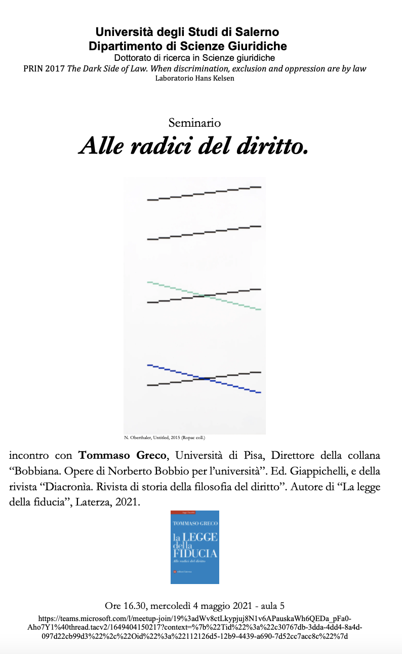 incontro con Tommaso Greco, Università di Pisa, Direttore della collana “Bobbiana. Opere di Norberto Bobbio per l’università”. Ed. Giappichelli, e della rivista “Diacronìa. Rivista di storia della filosofia del diritto”. Autore di “La legge della fiducia”, Laterza, 2021.