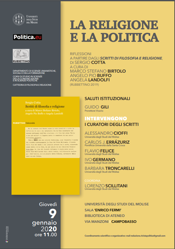 Riflessione a partire dagli Scritti di filosofia e religione di Sergio Cotta, a cura di M.S. Birtolo, A.P. Buffo, A. Landolfi (Rubettino 2019).