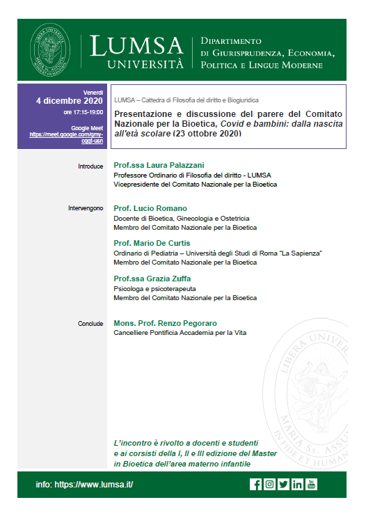 “Presentazione e discussione del parere del Comitato Nazionale per la Bioetica, Covid e bambini: dalla nascita all’età scolare (23 ottobre 2020)”