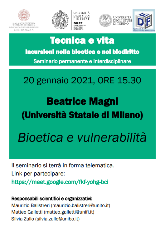 L’evento rientra nel ciclo “Tecnica e vita. Incursioni nella bioetica e nel biodiritto”. Il seminario si terrà su piattaforma telematica: https://meet.google.com/fkf-yohg-bci