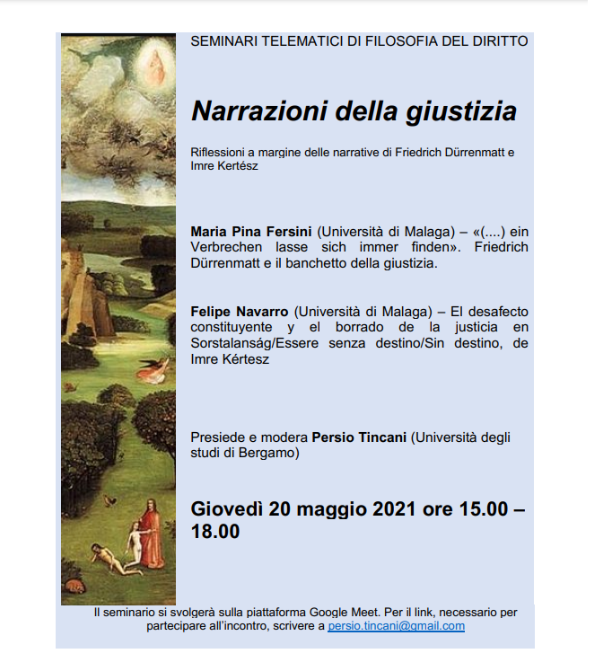 Maria Pina Fersini (Università di Malaga) e Felipe Navarro (Università di Malaga). Presiede e modera Persio Tincani (università degli Studi di Bergamo) Per partecipare, scrivere a: persio.tincani@gmail.com