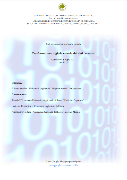 Introduce: Alberto Scerbo (Università degli Studi Magna Graecia di Catanzaro). Intervengono: Wanda D’Avanzo (Università degli Studi di Roma Unitelma Sapienza). Federico Costantini (Università degli studi di Udine), Alessandro Cortesi (Università Cattolica del Sacro Cuore di Milano)