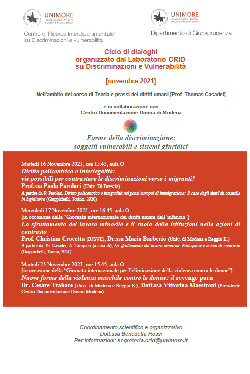 Ciclo di dialoghi organizzato dal Laboratorio CRID su Discriminazioni e Vulnerabilità, Forme della discriminazione: soggetti vulnerabili e sistemi giuridici, organizzato nell’ambito del corso di Teoria e prassi dei diritti umani (titolare Thomas Casadei)