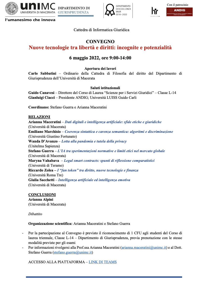– Per informazioni rivolgersi alla Prof.ssa Arianna Maceratini (arianna.maceratini@unimc.it) e al Dott. Stefano Guerra (stefano.guerra@unimc.it)