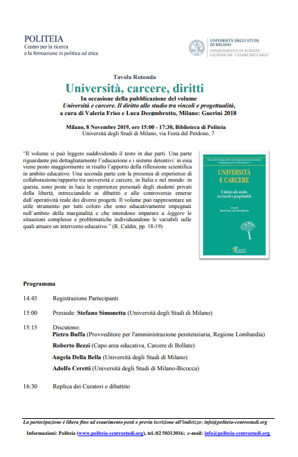 in occasione della pubblicazione del volume Università e carcere. Il diritto allo studio tra vincoli e progettualità, a cura di Valeria Frisio e Luca Decembrotto, Guerini, Milano 2018
