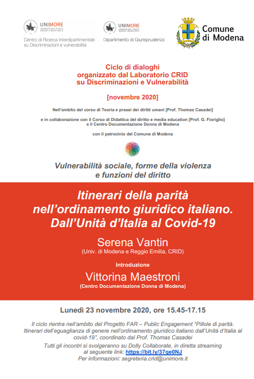“Itinerari della parità nell’ordinamento giuridico italiano. Dall’Unità d’Italia al Covid-19”