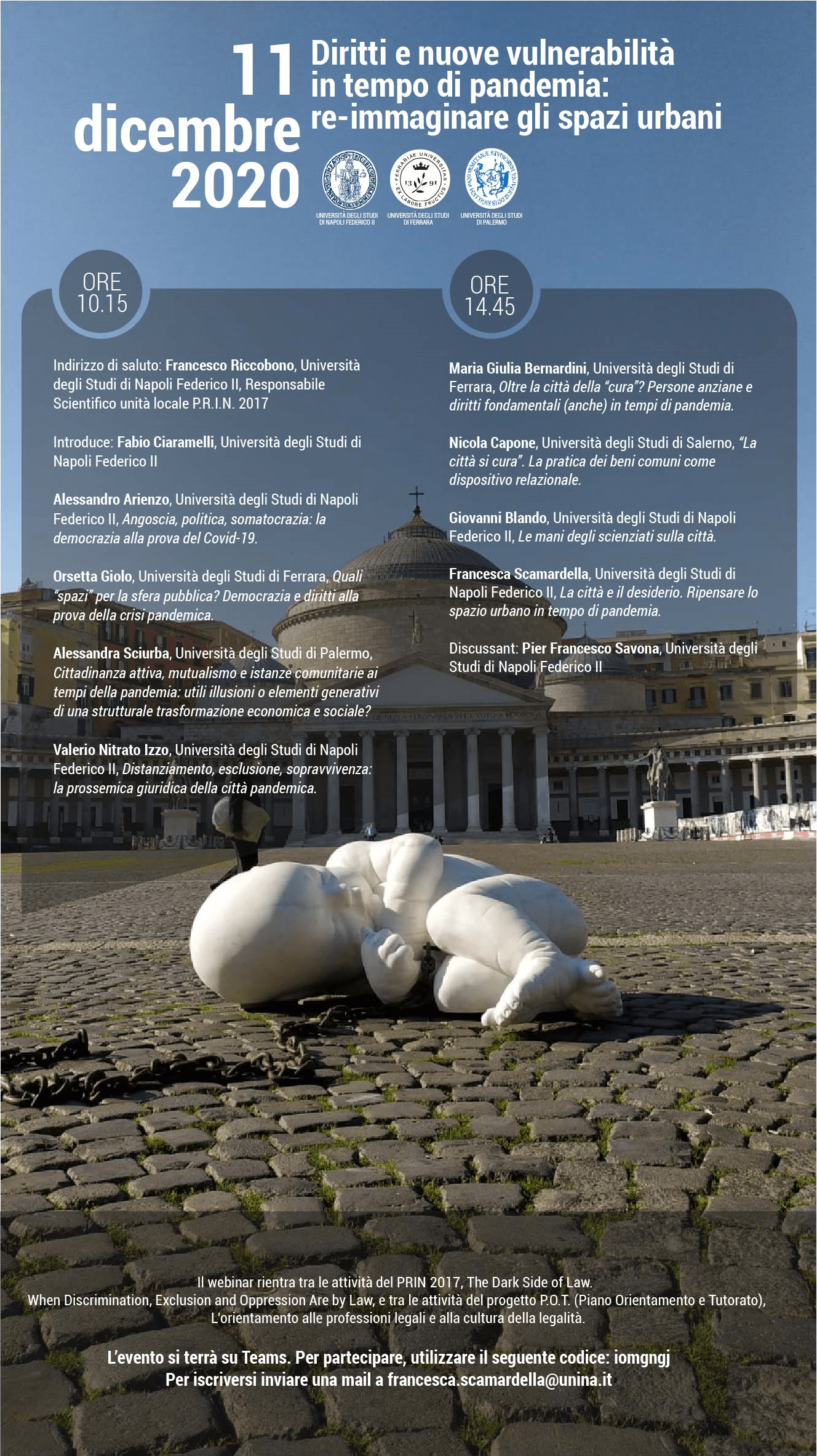 Sessione mattutina (ore 10.15): Alessandro Arienzo (Università degli Studi di Napoli Federico II), Angoscia, politica, somatocrazia: la democrazia alla prova del Covid-19; Orsetta Giolo (Università degli Studi di Ferrara), Quali “spazi” per la sfera pubblica? Democrazia e diritti alla prova della crisi pandemica, Alessandra Sciurba (Università degli Studi di Palermo), Cittadinanza attiva, mutualismo e istanze comunitarie ai tempi della pandemia: utili illusioni o elementi generativi di una strutturale trasformazione economica e sociale?, Valerio Nitrato Izzo (Università degli Studi di Napoli Federico II), Distanziamento, esclusione, sopravvivenza: la prossemica giuridica della città pandemica