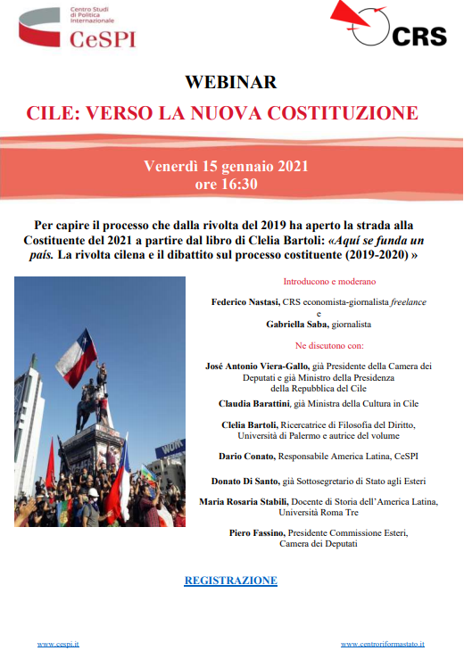 Ne discutono José Antonio Viera-Gallo, già Presidente della Camera dei Deputati e già Ministro della Presidenza della Repubblica del Cile; Clelia Bartoli, Università degli Studi di Palermo, Dario Conato, Responsabile America Latina, CeSPI; Donato Di Santo, già Sottosegretario di Stato agli Esteri; Maria Rosaria Stabili, Università Roma Tre; Piero Fassino, Presidente Commissione Esteri, Camera dei Deputati
