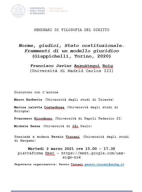 Discutono con l’Autore: Mauro Barberis (Università degli Studi di Bologna), Marina Lalatta Costerbosa (Università degli Studi di Bologna), Francesco Riccobono (Università degli Studi di Napoli Federico II), Michele Zezza (Università degli Studi di São Paulo). Presiede e modera Persio Tincani (Università degli Studi di Bergamo)