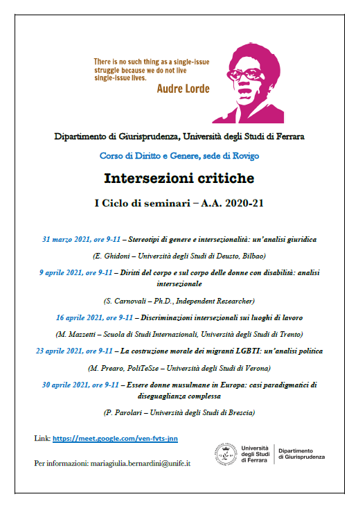 Il primo incontro si terrà il 31 marzo 2021, ore 9-11, ed avrà come tema “Stereotipi di genere e intersezionalità: un’analisi giuridica”, con relazione di E. Ghidoni (Università degli Studi di Deusto, Bilbao)