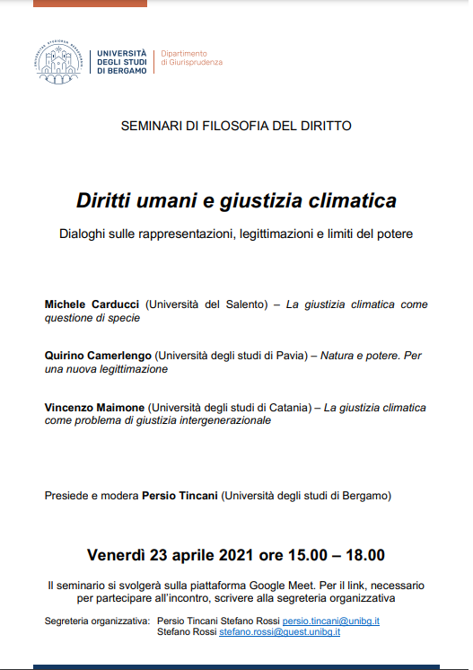 Relazioni di: Michele Carducci (Università del Salento), La giustizia climatica come questione di specie; Quirino Camerlengo (Università degli Studi di Pavia), Natura e potere. Per una nuova legittimazione; Vincenzo Maimone (Università degli Studi di Catania), La giustizia climatica come problema di giustizia intergenerazionale